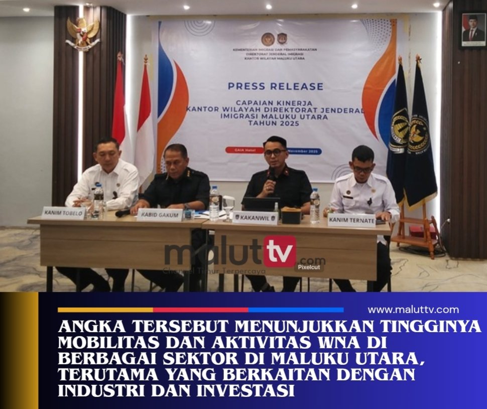 TERNATE, maluttv.com – Kantor Wilayah (Kanwil) Direktorat Jenderal Imigrasi Maluku Utara (Malut) melaporkan sebanyak 34.460 warga negara asing (WNA) tercatat masuk dan berada di wilayah Maluku Utara sepanjang periode Januari hingga November 2025. Data ini dihimpun dari dua satuan kerja imigrasi, yakni Kanim Kelas I TPI Ternate dan Kanim Kelas II Non-TPI Tobelo.
