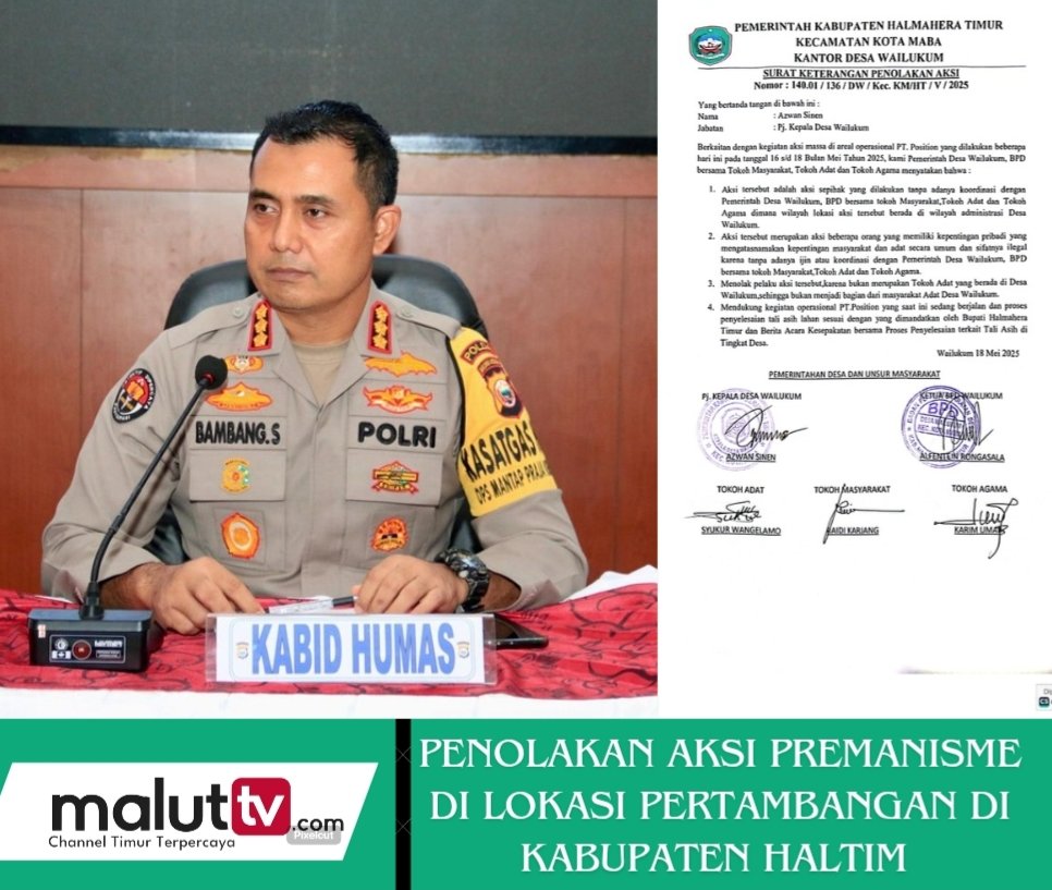 TERNATE, maluttv.com- Pemerintah Desa Wailukum, Kecamatan Kota Maba, Kabupaten Halmahera Timur bersama dengan para tokoh masyarakat, tokoh adat dan tokoh agama menolak aksi yang dilakukan sekelompok orang yang mengatasnamakan masyarakat di areal pertambangan yang ada di Halmahera Timur.