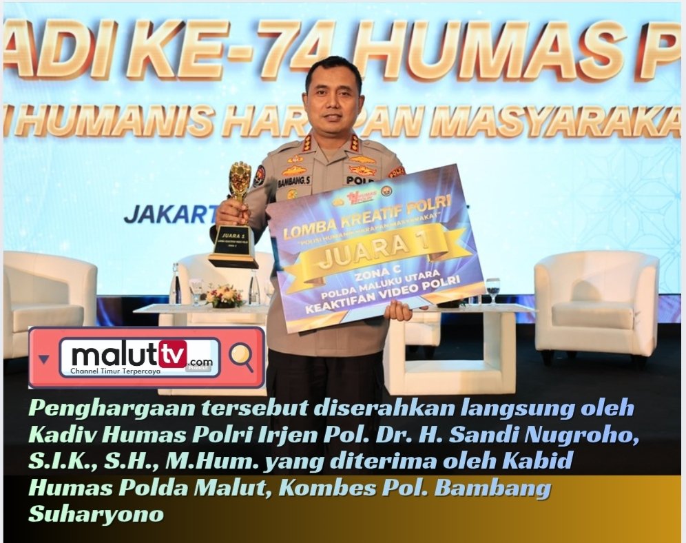 Penghargaan tersebut diserahkan langsung oleh Kadivhumas Polri Irjen Pol. Dr. H. Sandi Nugroho, S.I.K., S.H., M.Hum. yang diterima oleh Kabid Humas Polda Malut, Kombes Pol. Bambang Suharyono, S.I.K., M.H. dalam acara Sarasehan dan Dialog Kebangsaan bertajuk “Transformasi Polisi Humanis Guna mendukung harapan masyarakat” yang dilaksanakan di Auditorium STIK Lemdiklat Polri, Jakarta, Kamis (30/10/2025).