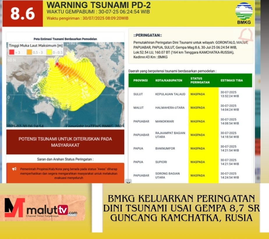 JAKARTA, maluttv.com– Gempa bumi berkekuatan magnitudo 8,7 Skala Rikter mengguncang wilayah pesisir timur Kamchatka, Rusia, pada Rabu (30/7/2025) pagi, memicu peringatan dini tsunami dari Badan Meteorologi, Klimatologi, dan Geofisika (BMKG).