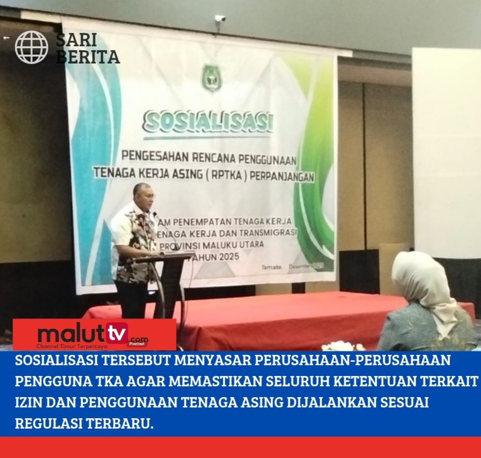TERNATE, maluttv.com- Dinas Tenaga Kerja dan Transmigrasi (Disnakertrans) Provinsi Maluku Utara kembali memperkuat pengawasan terhadap keberadaan tenaga kerja asing (TKA) di wilayahnya. Hal ini ditandai dengan pelaksanaan Sosialisasi Perencanaan Penggunaan Tenaga Kerja Asing (RPTKA) Perpanjangan yang berlangsung di Ballroom Bela Hotel Ternate, Kamis (11/12/2025).