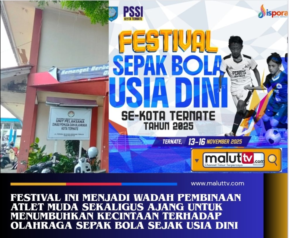 TERNATE, maluttv.com— Dinas Pemuda dan Olahraga (Dispora) Kota Ternate terus mematangkan persiapan pelaksanaan Festival Sepak Bola Usia Dini se-Kota Ternate Tahun 2025 yang dijadwalkan akan dibuka pada Kamis (13/11/2025) dan berlangsung hingga 16 November 2025.