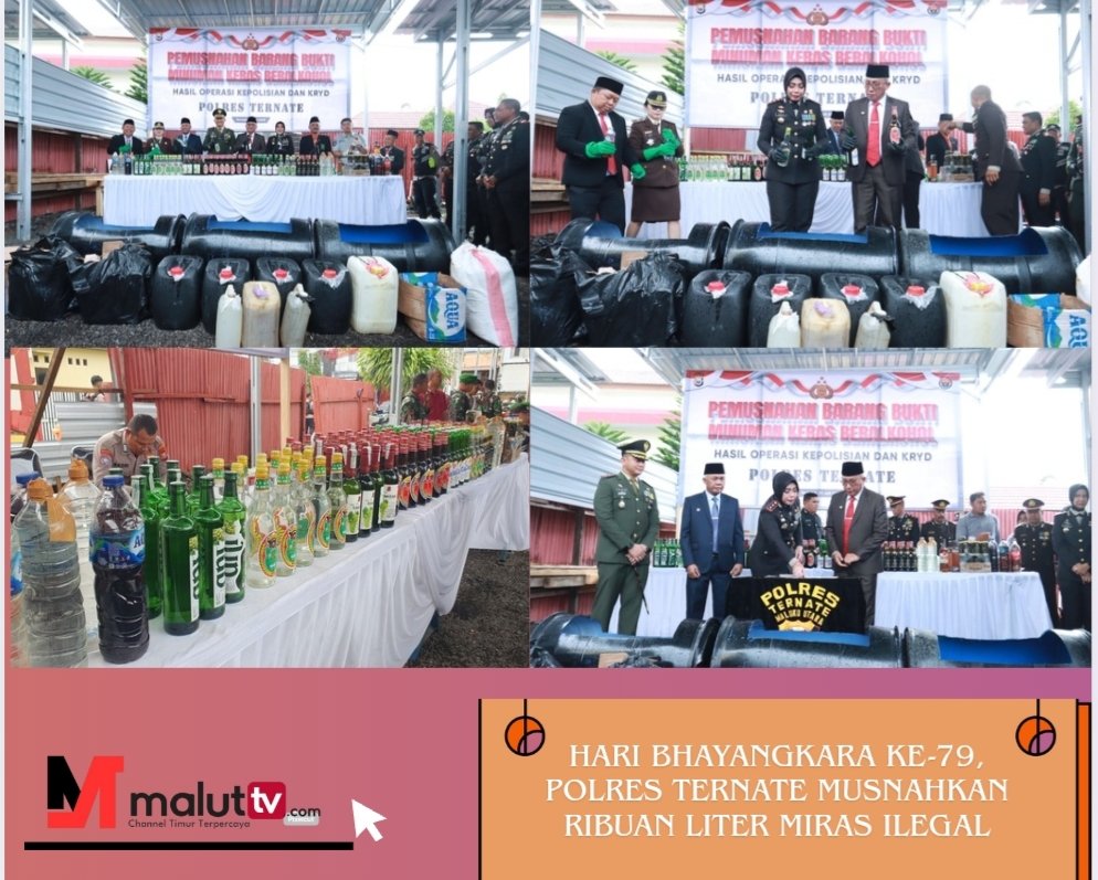 TERNATE, maluttv.com – Dalam rangka menyambut Hari Bhayangkara ke-79, Polres Ternate melaksanakan pemusnahan barang bukti minuman keras hasil operasi kepolisian dan KRYD di Mapolres Ternate, Kelurahan Takoma, Kecamatan Ternate Tengah, pada Selasa, (01/ 7/ 2025).