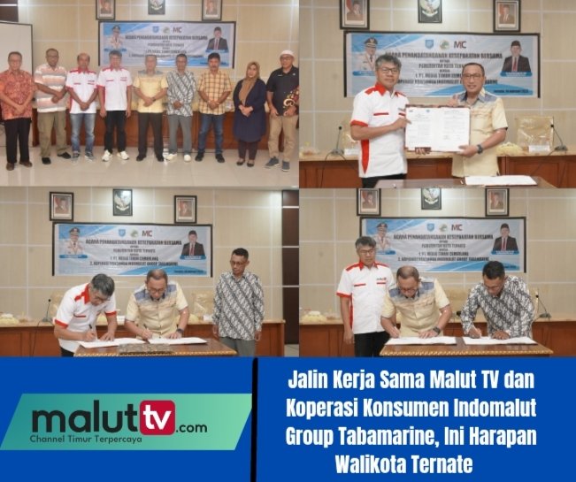 TERNATE, maluttv.com- Walikota Ternate, Dr. M. Tauhid Soleman resmi menjalin kerja sama di bidang sosialisasi dan publikasi dengan PT. Media Timur Cemerlang dan kerjasama di bidang ekonomi kerakyatan dengan Koperasi Konsumen Indomalut Group Tabamarine. Penandatanganan dokumen Memorandum Of Understanding yang digelar di Aula Lantai Tiga Kantor Walikota Ternate, Jumat, 14 Februari 2025 tersebut dihadiri para Assisten, Kepala Bagian Kerjasama Lembaga dan sejumlah Kepala Organisasi Perangkat Daerah atau OPD di jajaran pemerintahan Kota Ternate.