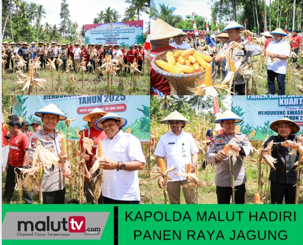 TIDORE, maluttv.com – Kapolda Maluku Utara, Irjen Pol Drs. Waris Agono, M.Si., menghadiri kegiatan Panen Raya Jagung Serentak Kuartal II dan peletakan batu pertama (ground breaking) pembangunan gudang penyimpanan jagung dan gabah, pada Kamis, (5/ 6/ 2025).
