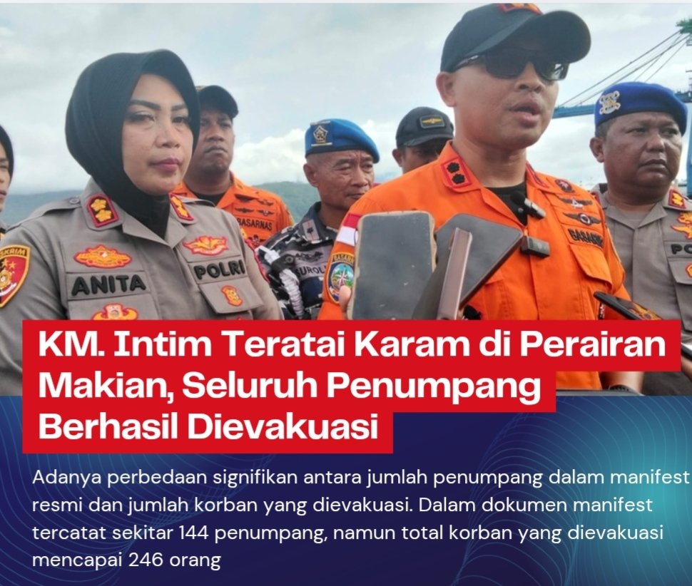 TERNATE, maluttv.com– Kapal Motor (KM) Intim Teratai dilaporkan karam di perairan Desa Makian, Kabupaten Halmahera Selatan, pada Selasa (17/2/2026) dini hari. Ratusan penumpang berhasil dievakuasi dalam operasi penyelamatan yang melibatkan tim SAR gabungan.