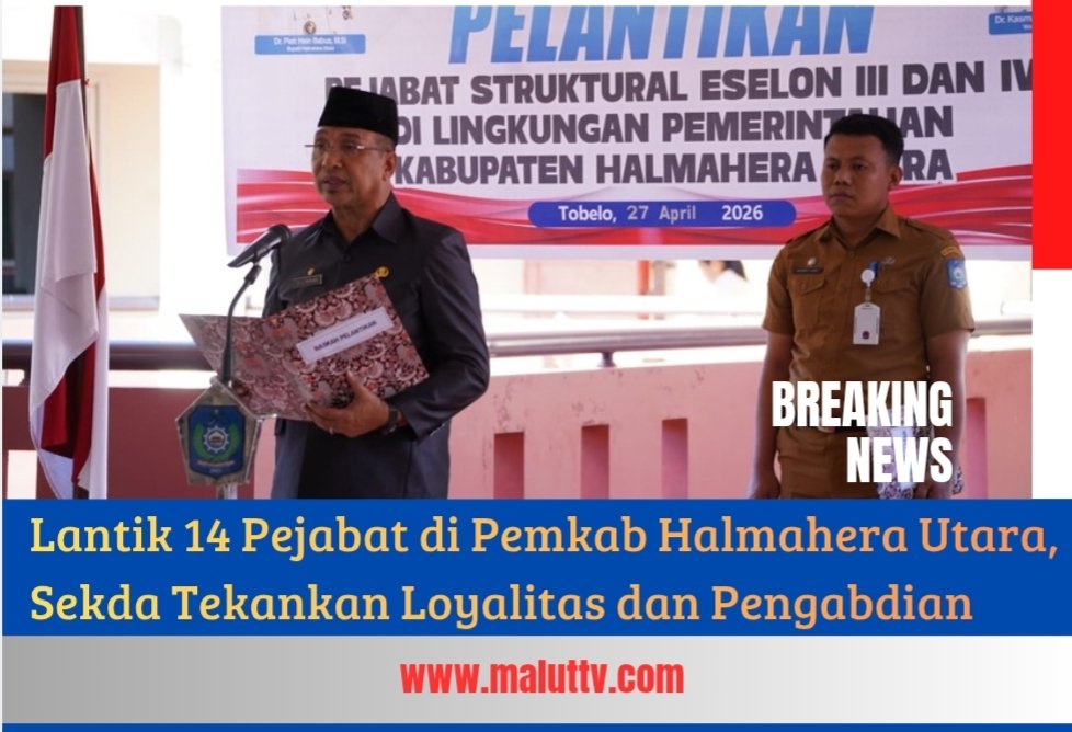 Prosesi pelantikan berlangsung di Kantor Bupati Halmahera Utara, Senin (27/4/2026), dan dipimpin langsung oleh Sekretaris Daerah Halmahera Utara, Erasmus J. Papilaya, berdasarkan Surat Keputusan Bupati Halmahera Utara Nomor 821.2/02/BKDPSDA/KEP/PD/2026 tentang Pengangkatan Pejabat Struktural di Lingkungan Pemerintah Kabupaten Halmahera Utara.