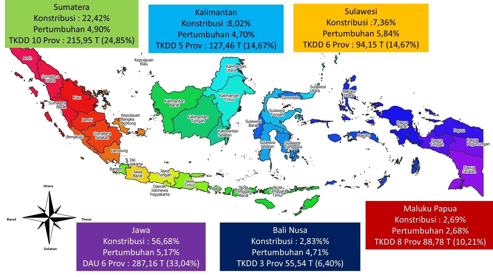 Pulau Jawa menjadi pemain utama yang menguasai 56,68% dari total pangsa pasar ekonomi nasional, disaat yang sama alokasi Transfer ke Daerah mencapai 33,04% atau Rp. 287,16 Triliun dari pagu nasional yang tersebar pada 6 Provinsi, sedangkan Papua dan Maluku, terdapat 8 Provinsi hanya mendapatkan alokasi 88,78% atau 10,21% dari total pagu nasional, disaat yang sama alokasi belanja pemerintah pusat yang tercermin dalam APBN masih tetap didominasi Pulau Jawa dan Sumatera, sehingga sulit bagi daerah-daerah lain untuk dapat mencapai kemajuan mendekati pulau Jawa apalagi setara pulau jawa kemustahilan yang tak mungkin terjadi.