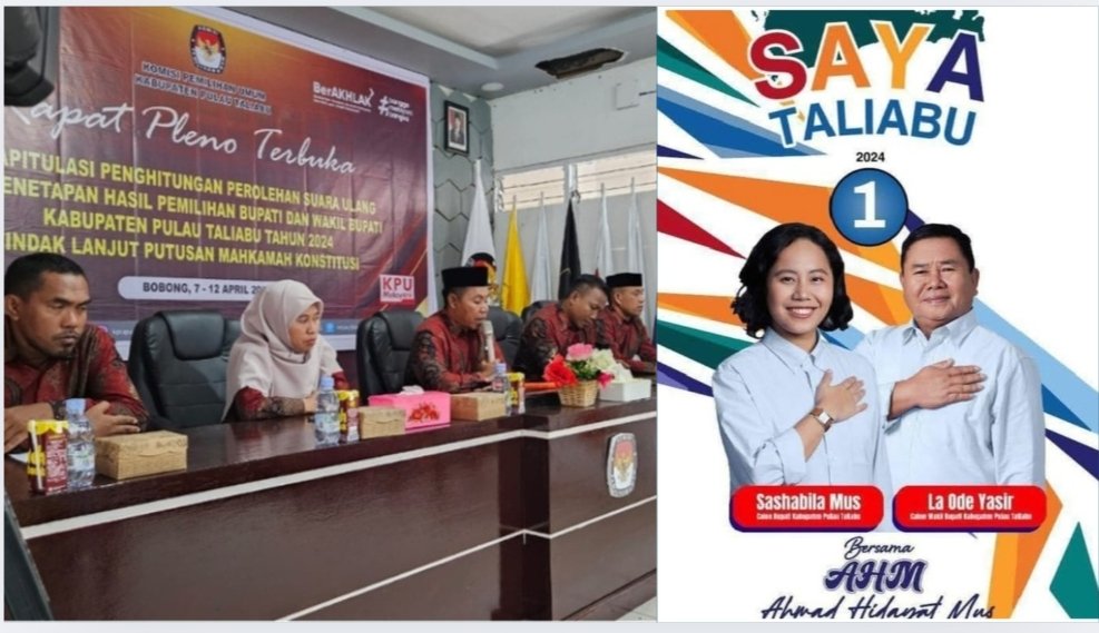 “Dengan ini kami menetapkan pasangan nomor urut satu sebagai peraih suara terbanyak dalam Pemilihan Bupati dan Wakil Bupati Taliabu,” ujar Rometi di hadapan para peserta rapat.