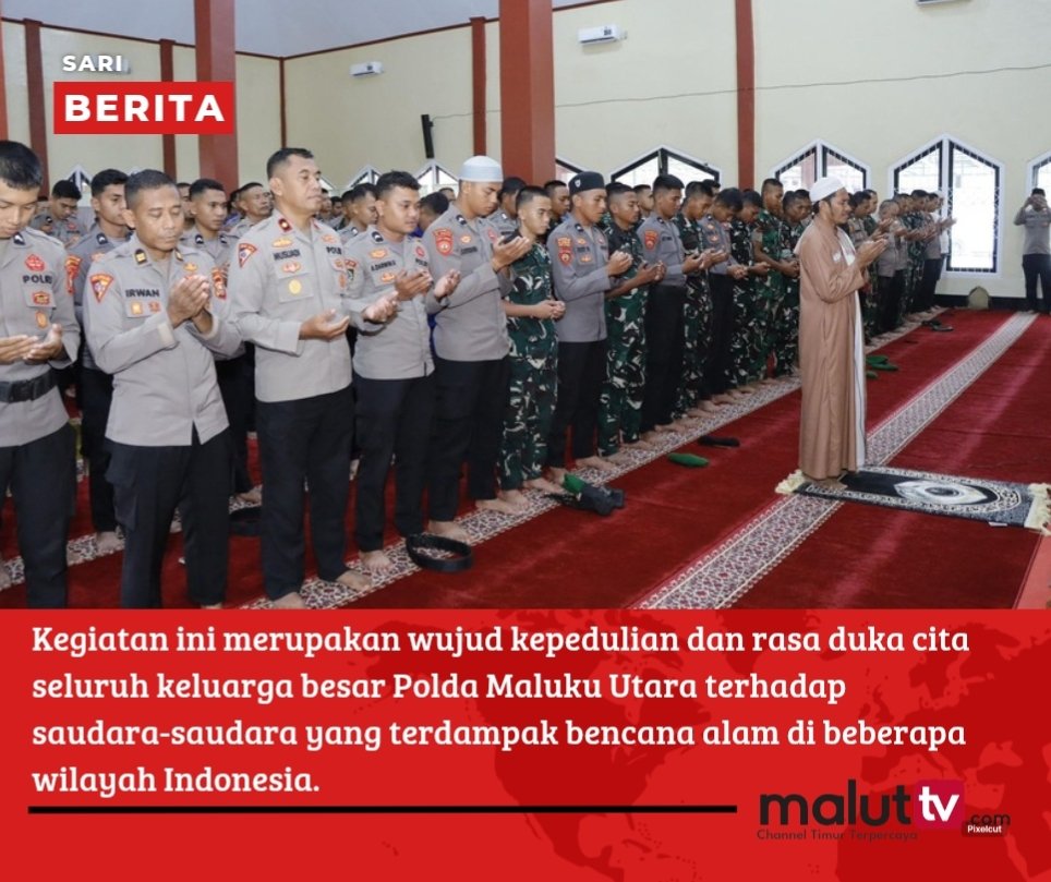 TERNATE, maluttv.com- Kepolisian Daerah Maluku Utara menggelar kegiatan Sholat Gaib dan Doa Bersama sebagai bentuk empati dan solidaritas kemanusiaan terhadap para korban bencana alam banjir di Provinsi Aceh, Sumatera Utara, dan Sumatera Barat, serta erupsi Gunung Semeru di Provinsi Jawa Timur, Kamis (4/12).
