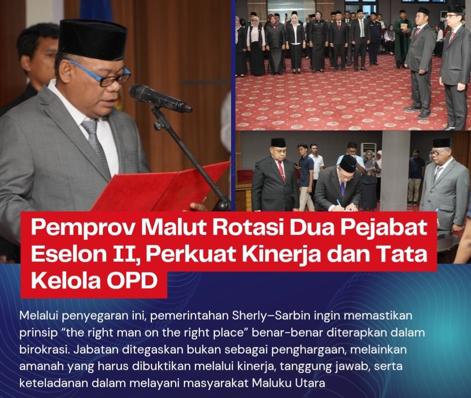 Melalui penyegaran ini, pemerintahan Sherly–Sarbin ingin memastikan prinsip “the right man on the right place” benar-benar diterapkan dalam birokrasi. Jabatan ditegaskan bukan sebagai penghargaan, melainkan amanah yang harus dibuktikan melalui kinerja, tanggung jawab, serta keteladanan dalam melayani masyarakat Maluku Utara. (Vita)