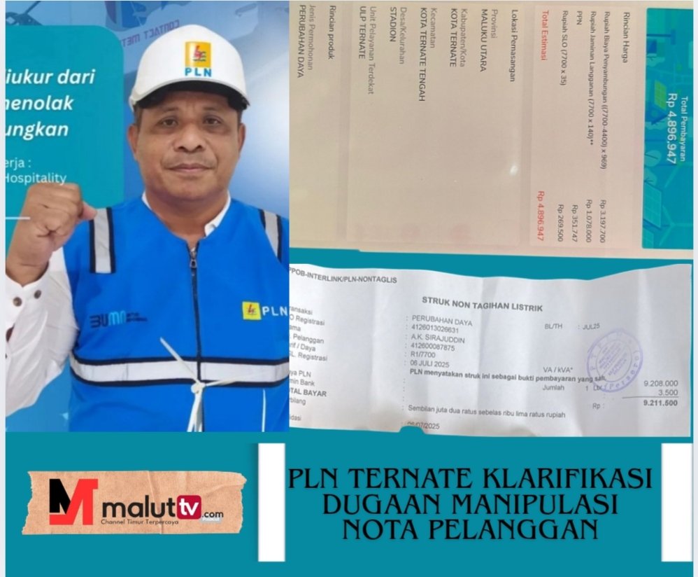 TERNATE, maluttv.com- Tindaklanjut dari pemberitaan sebelumnya mengenai dugaan manipulasi nota pembayaran penambahan daya pelanggan, PT PLN (Persero) ULP Ternate Selatan memberikan klarifikasi resmi terkait status terduga yang disebut-sebut sebagai oknum staf PLN.