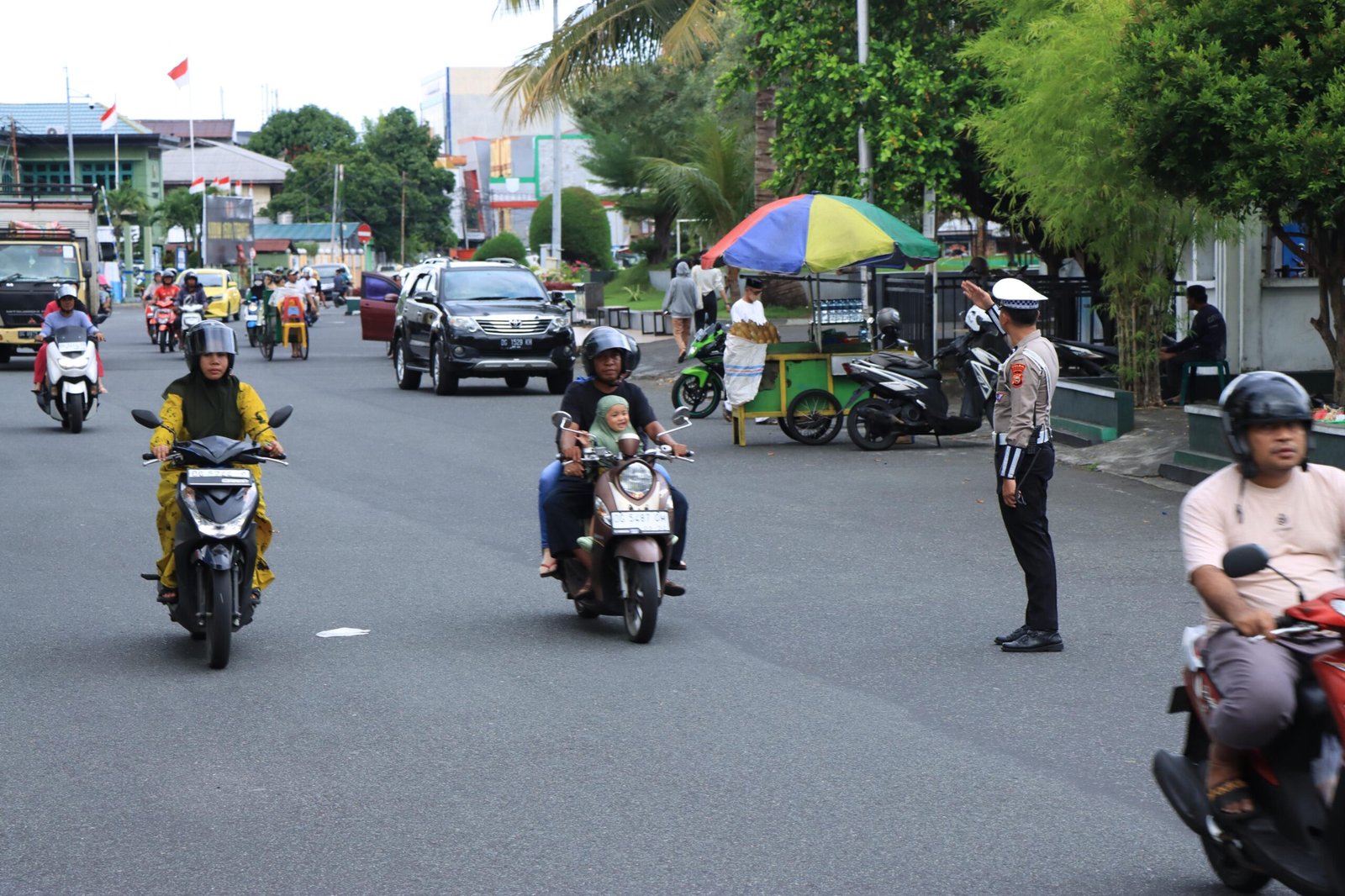 Personel Dit Lantas Polda Malut secara aktif memantau situasi arus lalu lintas dan melakukan pengawasan di titik-titik ramai guna memastikan kelancaran perjalanan masyarakat.