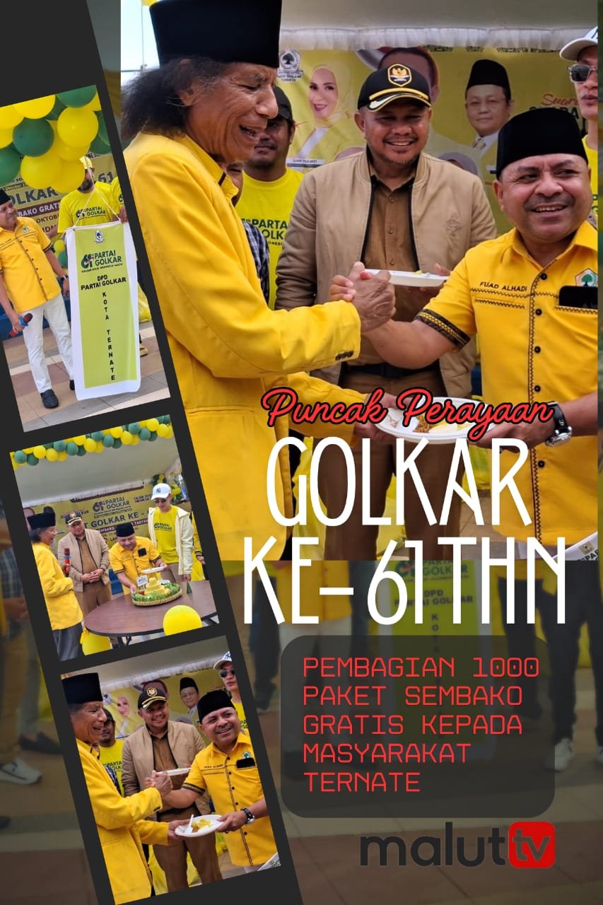 Dalam perayaan HUT Golkar ke-61, Golkar Ternate berbagi seribu paket sembako gratis kepada masyarakat dari berbagai kalangan dan profesi. Selain melepas balon gas ke udara, Haul Golkar yang digelar DPD II Partai Golkar Ternate di lokasi Landmark dipuncaki dengan acara pemotongan tumpeng oleh Ketua Fuad Alhadi dan disaksikan Hamid Usman dan Nuryadin. (dir/mtv)