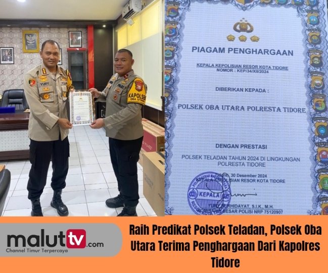 TIDORE, maluttv.com – Polsek Oba Utara mengukir prestasi gemilang di penghujung tahun 2024 dengan menerima Piagam Penghargaan sebagai Polsek Teladan dari Kepala Kepolisian Resort Tidore, Kombes Pol. Yury Nurhidayat. Penghargaan tersebut diserahkan langsung di Kantor Polresta Kota Tidore Kepulauan sebagai bentuk apresiasi atas kinerja unggul yang ditunjukkan Polsek Oba Utara, pada Selasa (31/ 12/ 2024)