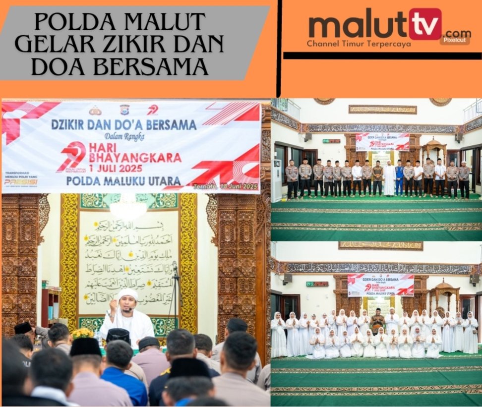 TERNATE, maluttv.com– Dalam rangka menyambut Hari Bhayangkara ke-79 Tahun 2025, Polda Maluku Utara menggelar kegiatan Dzikir dan Doa Bersama yang berlangsung khidmat di Masjid Nurul Huda Polda Maluku Utara, pada Rabu (18/6/2025).