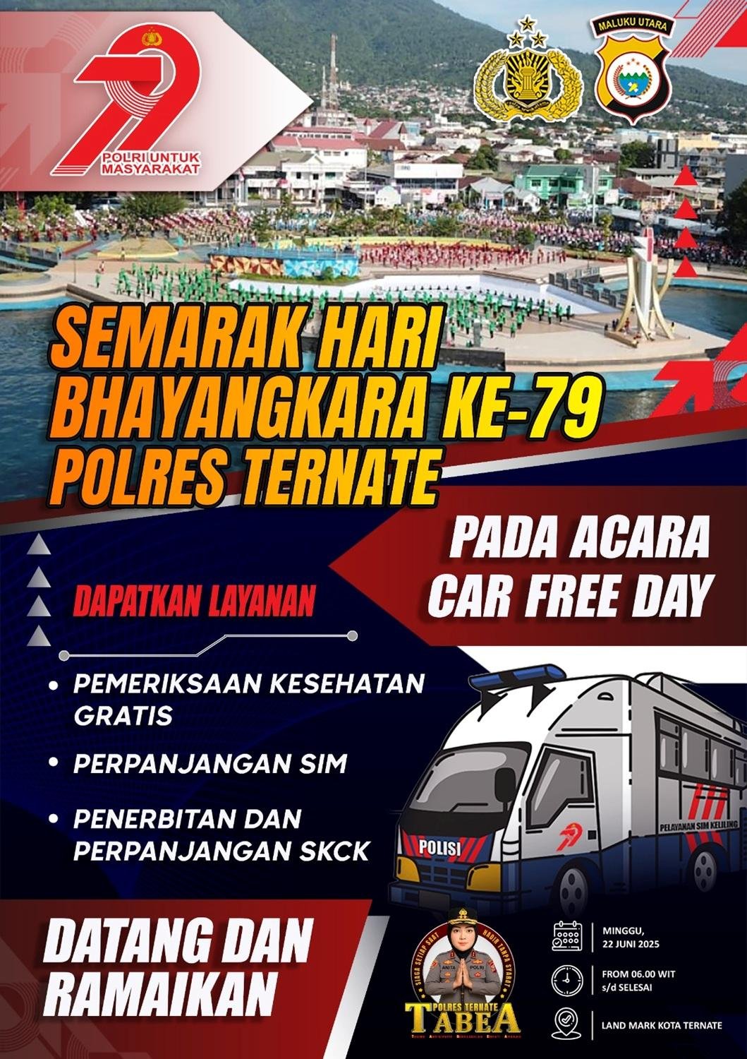 TERNATE, maluttv.com – Dalam rangka memperingati Hari Bhayangkara ke-79, Polres Ternate mengajak seluruh masyarakat untuk datang dan memanfaatkan berbagai pelayanan publik gratis yang akan digelar saat Car Free Day, pada Minggu, 22 Juni 2025, mulai pukul 06.00 WIT hingga selesai di Land Mark Kota Ternate.