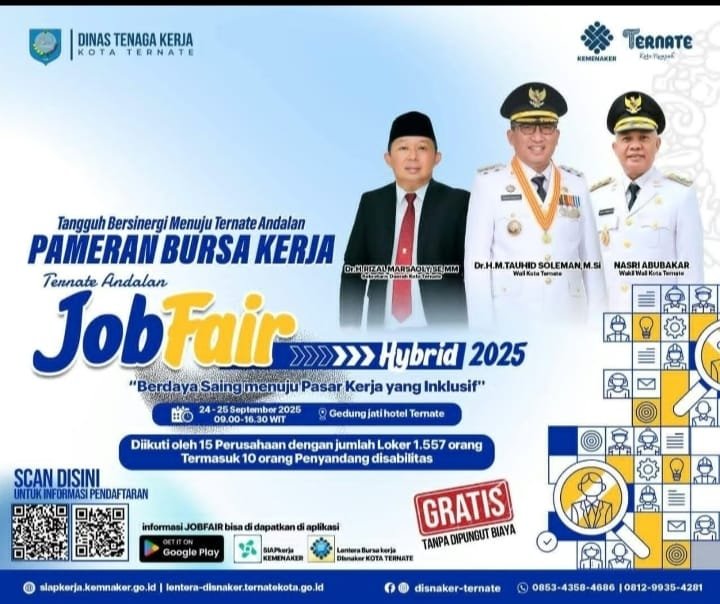 TERNATE, maluttv.com – Pemerintah Kota Ternate melalui Dinas Tenaga Kerja bakal menggelar Job Fair Hybrid atau pameran bursa kerja pada 24–25 September 2025 mendatang. Acara itu berlangsung di Jati Hotel mulai pukul 08.00 WIT hingga selesai.