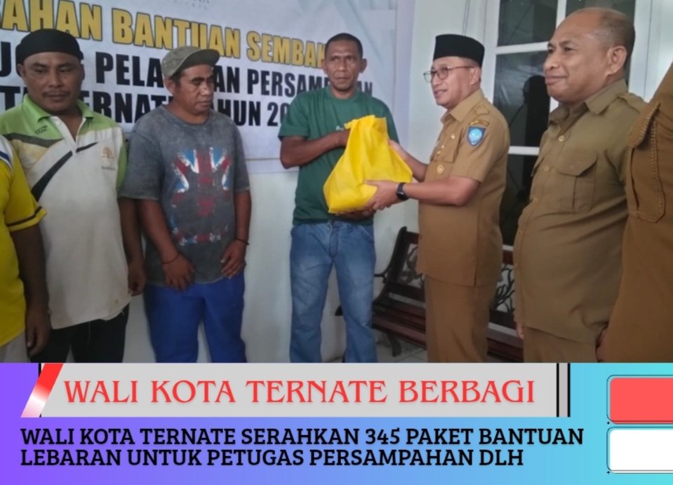 TERNATE, maluttv.com – Wali Kota Ternate, Tauhid Soleman menyerahkan secara langsung paket bantuan menjelang Hari Raya Idul Fitri kepada petugas layanan persampahan di lingkungan Dinas Lingkungan Hidup (DLH) Kota Ternate. Sebanyak 345 paket bantuan tersebut merupakan dukungan dari PT Trimegah Bangun Persada Tbk yang merupakan bagian dari Harita Group.