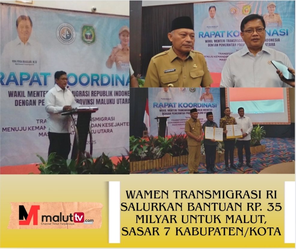 TERNATE, maluttv.com – Wakil Menteri Transmigrasi Republik Indonesia, Viva Yoga Mauladi, menyalurkan bantuan sebesar Rp. 35 miliar kepada Provinsi Maluku Utara. Bantuan tersebut akan didistribusikan ke tujuh kabupaten/kota dan masuk dalam program prioritas APBN tahun anggaran 2025. Penyerahan bantuan berlangsung saat kegiatan Rapat Koordinasi Pemerintah Provinsi Malut, di Hotel Sahid Bela, Selasa (15/ 7/ 2025).