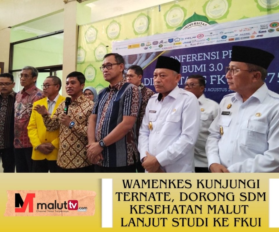 TERNATE, maluttv.com – Wakil Menteri Kesehatan Republik Indonesia, Prof. Dr. Dante Saksono Harbuwono, Sp.PD-KEMD, Ph.D, melakukan kunjungan kerja ke Kota Ternate dalam rangkaian peringatan Dies Natalis ke-75 Fakultas Kedokteran Universitas Indonesia (FKUI). Kegiatan tersebut berlangsung di Gedung Rektorat Universitas Khairun (Unkhair) Ternate.