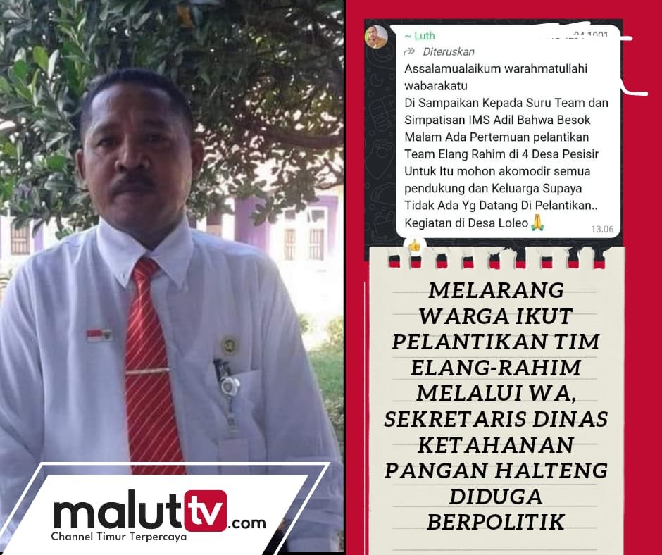 Setelah Kepala Dinas Pemberdayaan Masyarakat Desa (PMD), Mustamil Jama membiarkan spanduk Ikram M. Sangadji menjadi latar belakang pertemuan saat penyalurkan bantuan sosial di Desa Sosowomo, Kecamatan Weda Selatan, kini beredar narasi himbauan bernada larangan kepada warga Desa Loleo agar tidak menghadiri acara pelantikan tim Elang-Rahim via WhatsApp yang diduga berasal dari Sekretaris Dinas Ketahanan Pangan Halmahera Tengah, Lutfi Tutupoho.